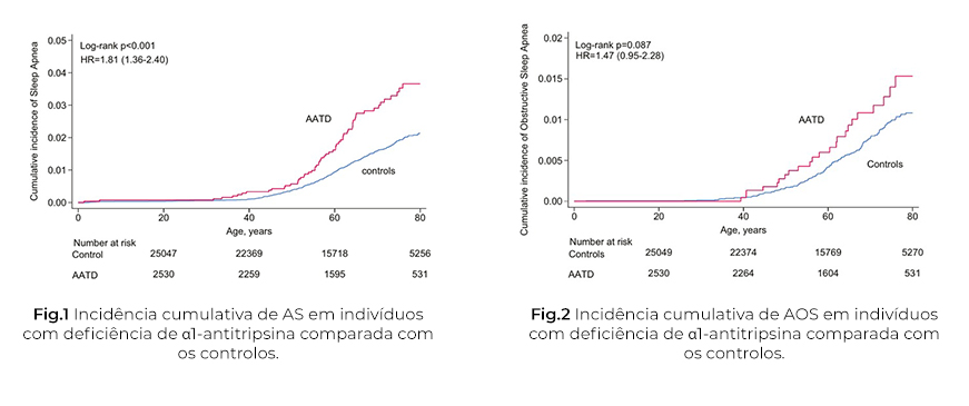 Foi realizada a estratificação por múltiplos fatores confundidores relevantes, como DPOC, doenças cardiovasculares, diabetes tipo 2, doença hepática, idade e sexo o que permite um controlo mais rigoroso das associações observadas. A principal conclusão é que os indivíduos com DAAT têm um risco aumentado de AS (HR 1,81; IC 95 %: 1,36–2,40), independentemente da presença de DPOC (Fig.1). Resultados semelhantes foram encontrados quando avaliado o risco para AOS mas sem resultados estatisticamente significativos (HR 1.47 (IC 95 %: 0,95–2,28) (Fig.2). Estes dados são particularmente relevantes, pois sugere uma possível via fisiopatologia distinta, sugerindo um mecanismo adicional à limitação ventilatória periférica, centrado na colapsabilidade faríngea e possivelmente relacionada com a degradação de tecidos elásticos na via aérea superior.